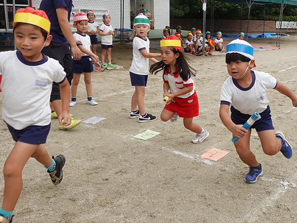 ■ところが正午過ぎ、園庭が騒がしくなりました。降りると中止になったはずの年長のリレー。担任からか子ども達からの突き上げか、昼食時間をやりくりして走っていました。ギャラリーはゼロ。園庭は意外と水はけが良かったので整備にそれほど時間をかけなくてもできたようです。「年長のリレーあります!」とホームページで流したら、昼食を途中でおいて駆け付けられた方もいるでしょうね。次回、次回。ごめんなさい。と、言っておきながら…。前の子を追い越そうと必死の形相で駆け抜けた子もいました。リレー熱は実際に行なわなくても、体内で熟しつつあるのでしょう。