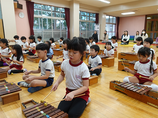 ■年長と最後のボックスホンをしました。「ソ」音一音だけで始まったボックスホンも今日は1オクターブ全部の音盤をセットして「パパはママが好き」を20分ほどの指導で演奏しました。この曲のメロディーはほぼ音階通りなのでとても弾きやすいのです。後半部はちょっと細工をしてもっと簡単に。探り弾きも容易なので、来週水曜日に年中の残りのクラスとボックスホンをしたら保育室に数台ずつ持って行くので部屋からパパはママが好きが聞こえてくるでしょう。