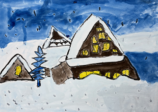 ■準備物:画用紙(ゆき)、墨、個人持ち絵の具(茶色+黒、黄色に限定)、設定絵の具(空色、白)