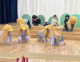 ■次は2歳児。当園の最年少児と見比べてしまします。でもこの子達は0歳や1歳から発表会を経験しています。2歳児は当園の年少で行なった「ジャックと豆の木」。でも少し前のだから充分2歳児でも行えます。